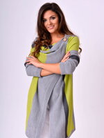 Dámský pletený kardigan je v zajímavém spojení barev šedé a pistáciové. Je vyroben z kvalitního a příjemného materiálu na dotyk, takže je vhodný pro celodenní nošení. Je to dlouhý kardigan, sahá do poloviny stehen. Kardigan je obohacen dvěma knoflíky na ramenou jedním z vnější a vnitřní strany. Knoflíky jsou z imitace dřeva. Tento teplý pletený kardigan můžete využít i místo mikiny, svetru nebo tenčí bundy. Střih tohoto kardiganu je moderní a volný, proto je vhodný i pro těhotné ženy. Díky své kombinaci barev je tento kardigan HITEM letošního podzimu, určitě nesmí chybět ani ve Vašem šatníku.