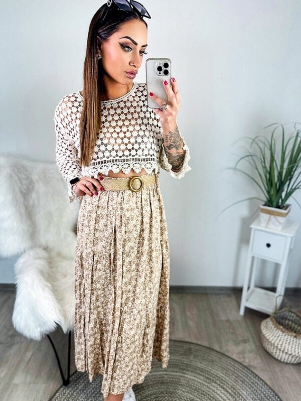 NOVINKA! Nádherné dámské kalhoty v krémové barvě s květinovým vzorem. Sukně je vyrobena ze vzdušného materiálu. Vhodné pro každodenní nošení. Volný střih zaručí vaše pohodlí. Vhodné pro velikosti S, M a L.