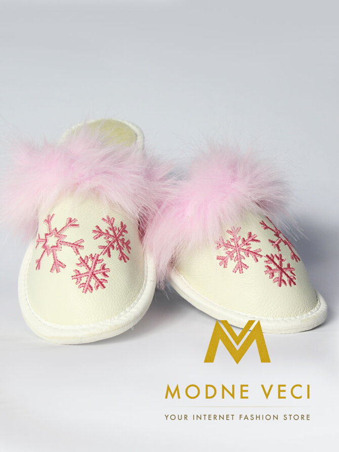 Blíží se Vánoce a vy ještě nemáte dárek pro svou dceru, vnučku, manželku, maminku nebo babičku? Neváhejte a objednávejte si tyto nádherné papuče s Vánoční vločkou. Papuče jsou vyrobeny z hladké kůže, čímž se značně prodlouží jejich životnost. Barva je bílá, která je doplněna o růžovou vyšívku ve tvaru sněhové vločky na přední straně. Okraj papuček je zdoben růžovými vláskami, které jim dodávají nádech a jedinečnost. Vnitřek papuč je vyteplený, takže vašim chodidlům už nikdy víc nebude zima. Barva bílá s růžovou výšivkou. Krásná aplikace růžové vločky.